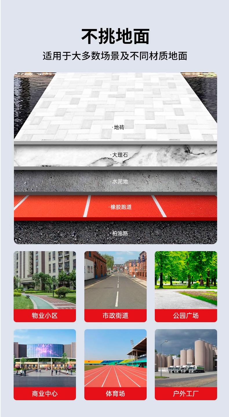 適用場所:吸塵、掃地、噴水相結(jié)合的自動清潔一體機,主要用于飛機場、公園、環(huán)衛(wèi)、廠區(qū)、游樂園、廣場、高校、保潔公司、物業(yè)管理公司等的室外清掃。